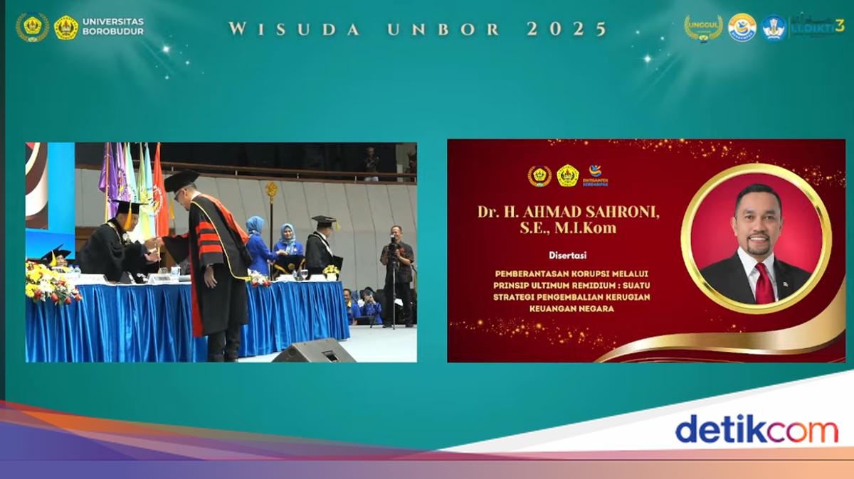 “Kami panggilkan wisudawan wisudawati Inisiatif pascasarjana Universitas Borobudur Inisiatif Studi Doktor Ilmu Hukum Bersama gelar Doktor Ilmu Hukum. Wisudawan wisudawati dimohon berdiri. Dr H Ahmad Sahroni SE MIKom,” ujar protokoler wisuda memanggil Sahroni dikutip, Rabu (15/10/2025).